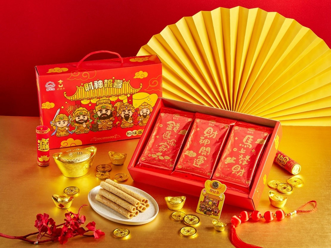 喜年來與金山財神廟聯名限定「財神報喜」蛋捲禮盒,為年節送禮首選增添更深一層寓意。(圖/喜年來提供)