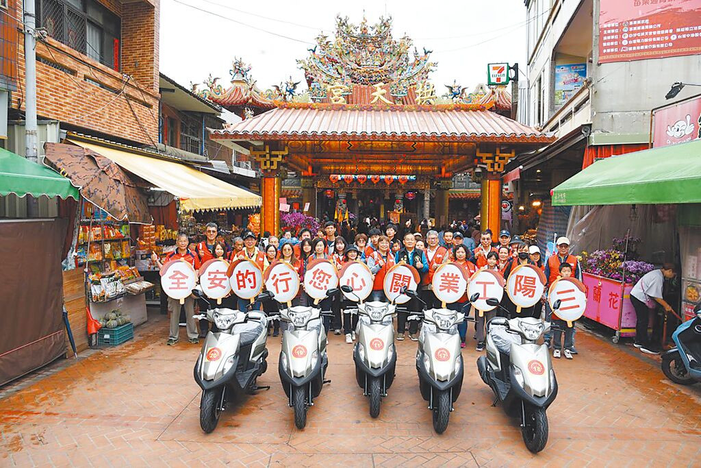 三陽志工團隊從拱天宮出發,沿路擦亮525面反光鏡,為白沙屯媽祖進香活動奉獻心意。(三陽提供/黃琮淵台北傳真)