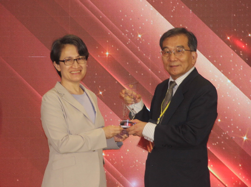 蕭美琴副總統(左)頒發特殊貢獻獎給賴兩陽教授。