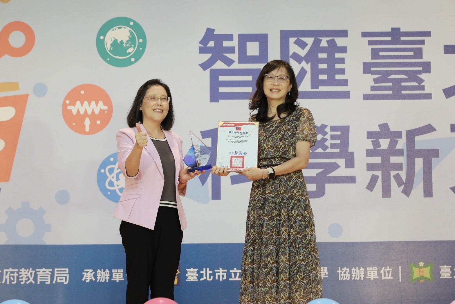 臺北市教育局楊淑妃專門委員(左)頒獎給優良指導教師鑽石獎的得獎者陳佳宜老師(右)。