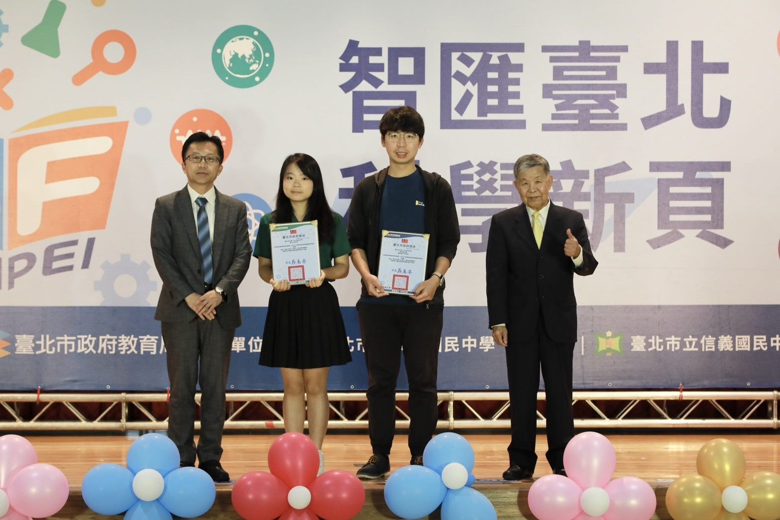 評審總召何榮桂教授(右)頒發國中組特優得獎作品-《人車碰撞預測應用於十字路口之前導性研究》。(圖/臺北市政府教育局提供)