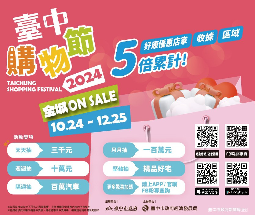台中城市行銷邁向國際!2024台中購物節於1024日重磅登場。此次首創由市長盧秀燕與比利時台北辦事處馬徹處長、新加坡駐台北商務辦事處葉偉傑代表與日本台灣交流協會台北事務所片山和之代表共同推廣台中購物節。今年活動擴大舉辦,不只台中市政府提供獎項,更邀請商家共同推出各式獎項,已有破萬家的商家加入今年優惠行列,歡迎全國民眾1225日前來台中消費更划算!