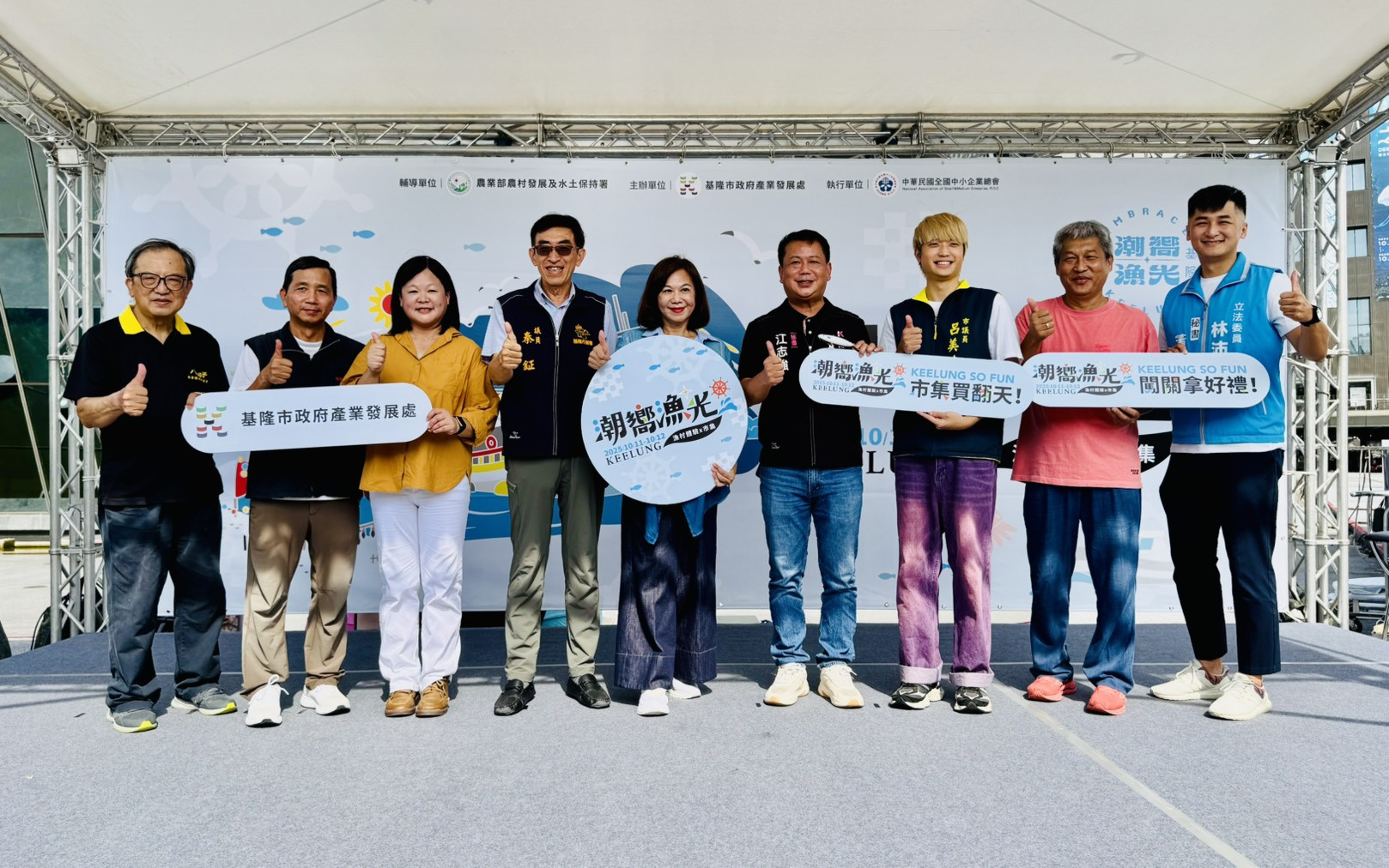 潮嚮漁光市集開幕儀式由基隆市政府邱佩琳副市長(左五)、產業發展處蔡馥嚀處長(左三)、童子瑋議長代表(左六)、秦鉦議員(左四)、呂美玲議員代表(左七)出席合影