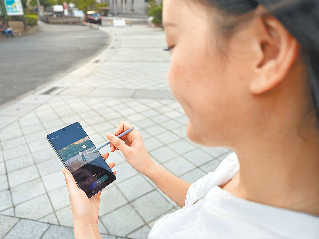 伊林模特兒林玟萱對三星Galaxy S25 Ultra能以S Pen精準清除物件印象深刻。(古明弘攝)