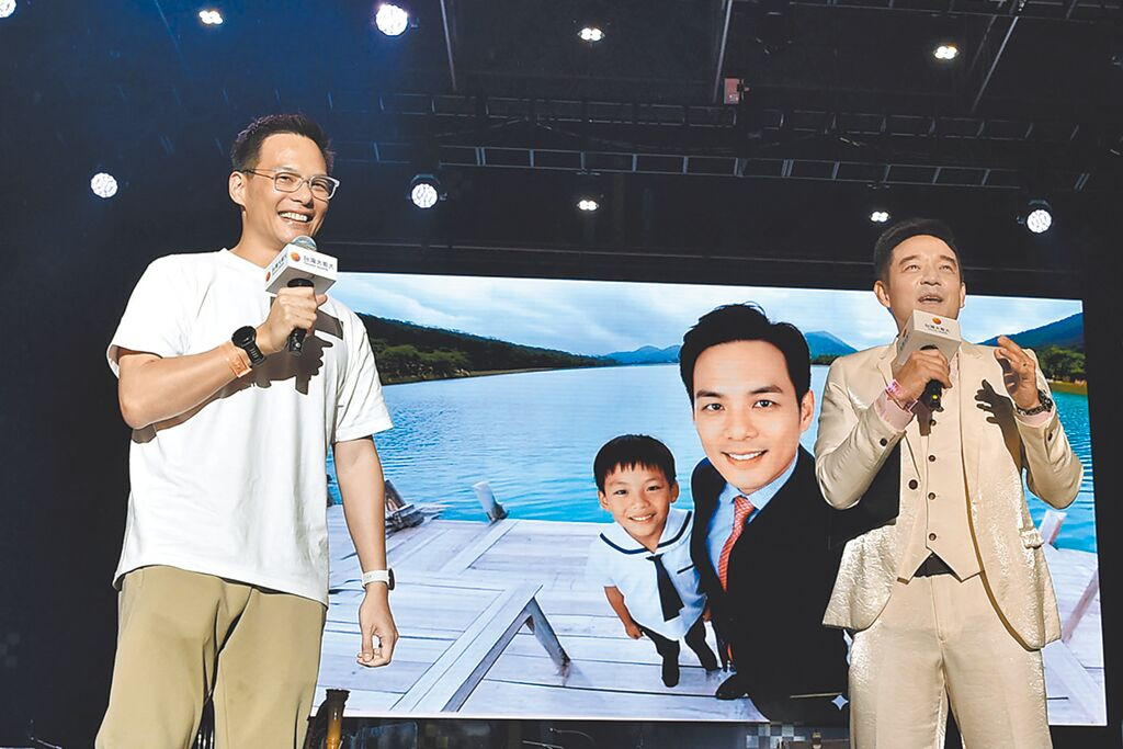 台灣大總經理林之晨(左)開場致詞,並首度於音樂會中透過台灣大開發的AI技術,與6歲的自己同框。(台灣大提供)