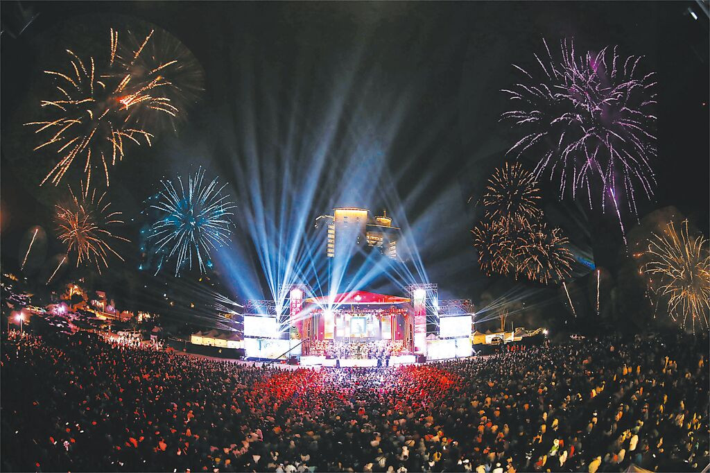 「2025台灣大哥大日月潭花火音樂會」首度於舞台左右兩側施放180度環繞、長達450秒的花火,閃耀日月潭湖畔。(台灣大提供)
