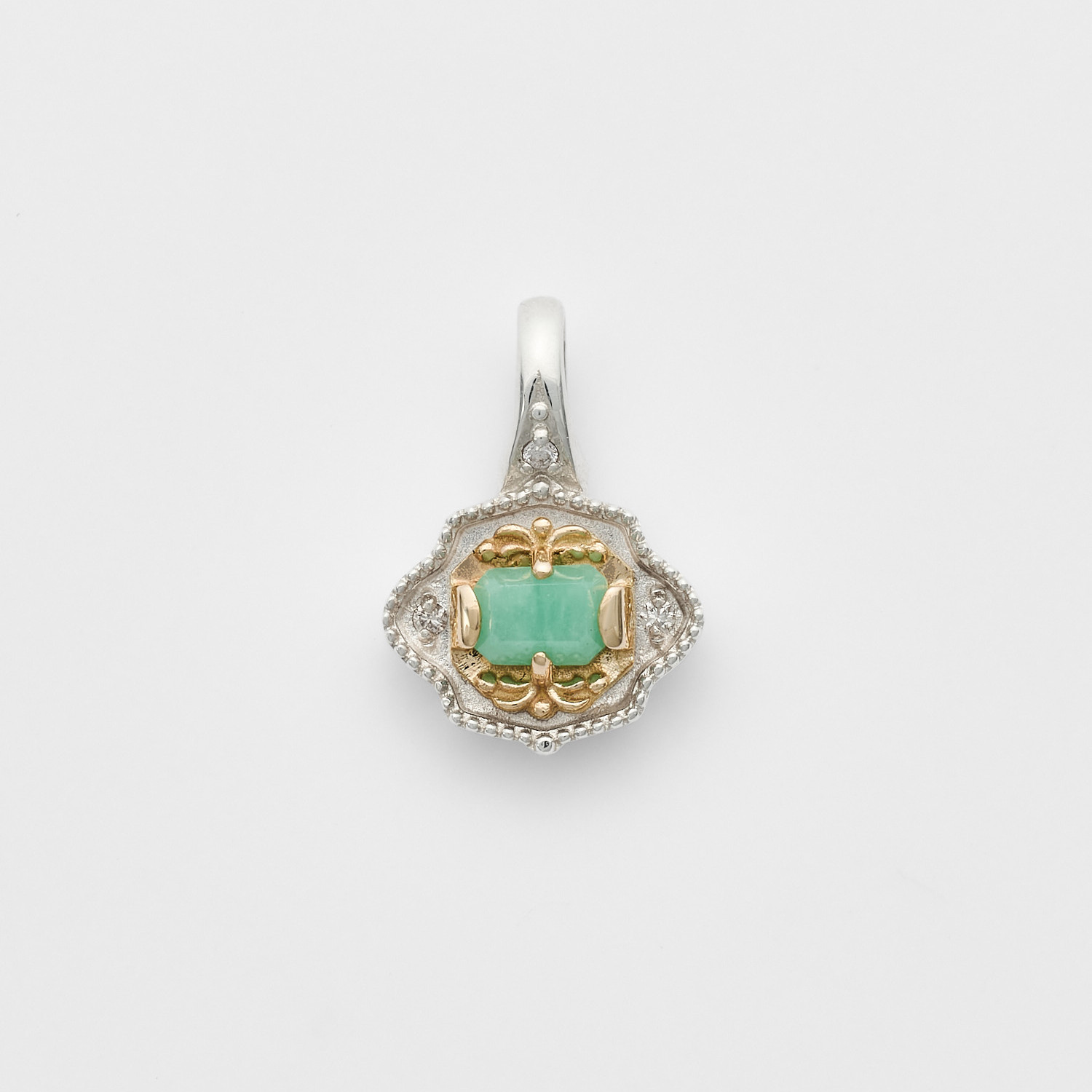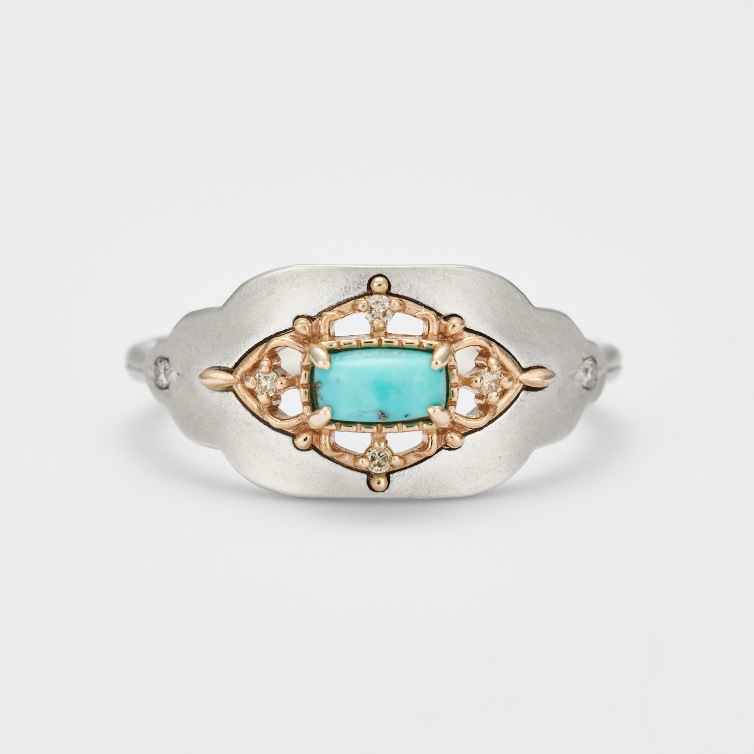 將銀色霧面紋理與金色鏤空雕刻設計結合,散發出異國情調的氛圍。中央方形綠松石營造高雅印象,鑲鑽細節閃耀低調光芒,成熟而優雅。