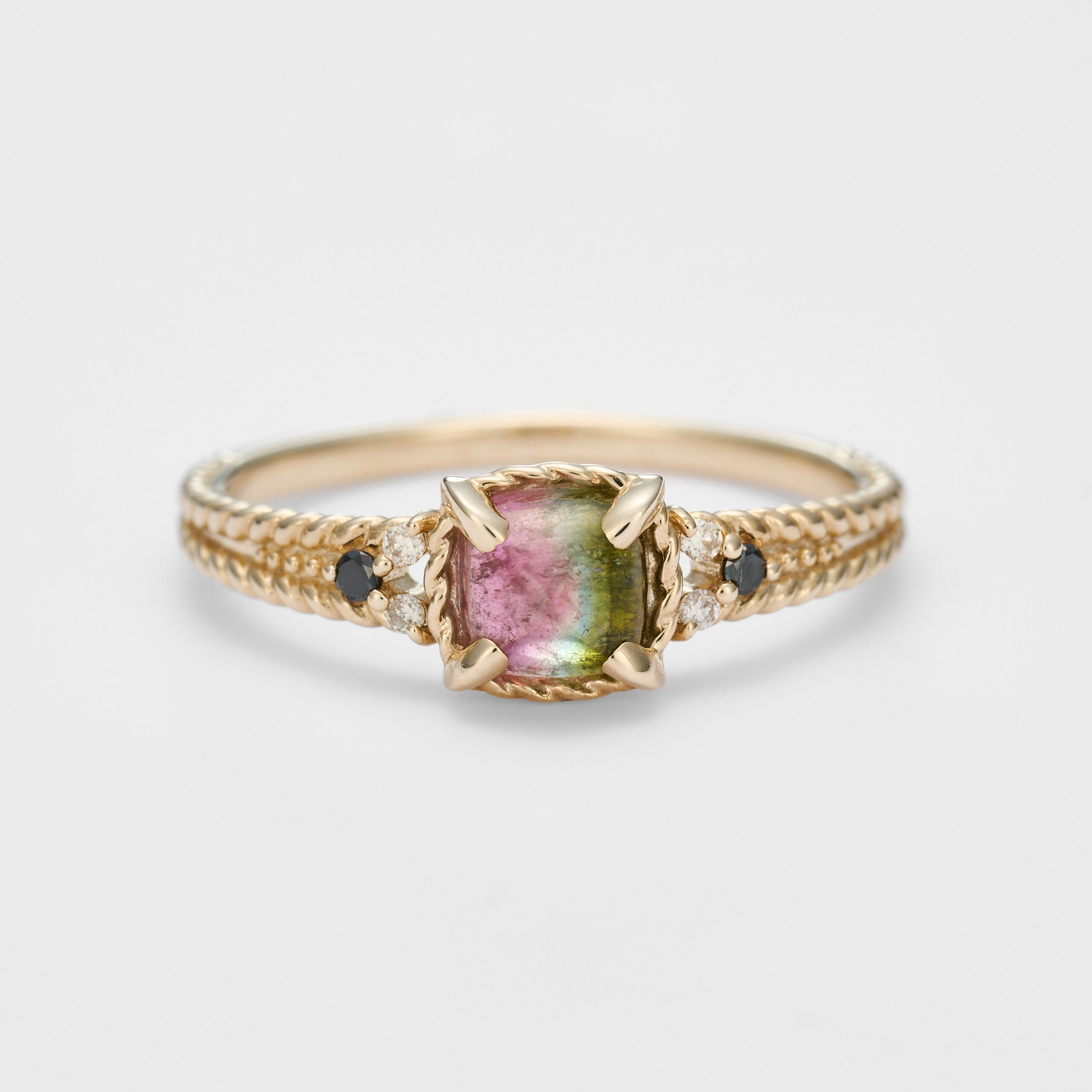 選用雙色「Parti-colored」碧璽,色彩層層交疊如同彩虹幻影,側邊搭配黑白鑽與繩索紋理,呈現療癒且充滿變化的魅力。