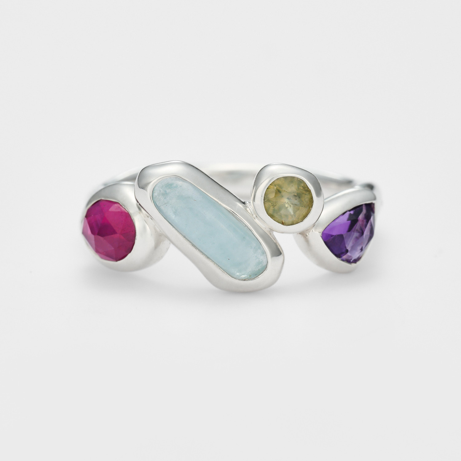 融合 2 月紫水晶、3 月海藍寶石、7 月紅寶石與 9 月藍寶石的設計,鮮豔的四色組合吸睛又具個性。不規則排列與立體金屬結構,為日常穿搭增添搶眼亮點。