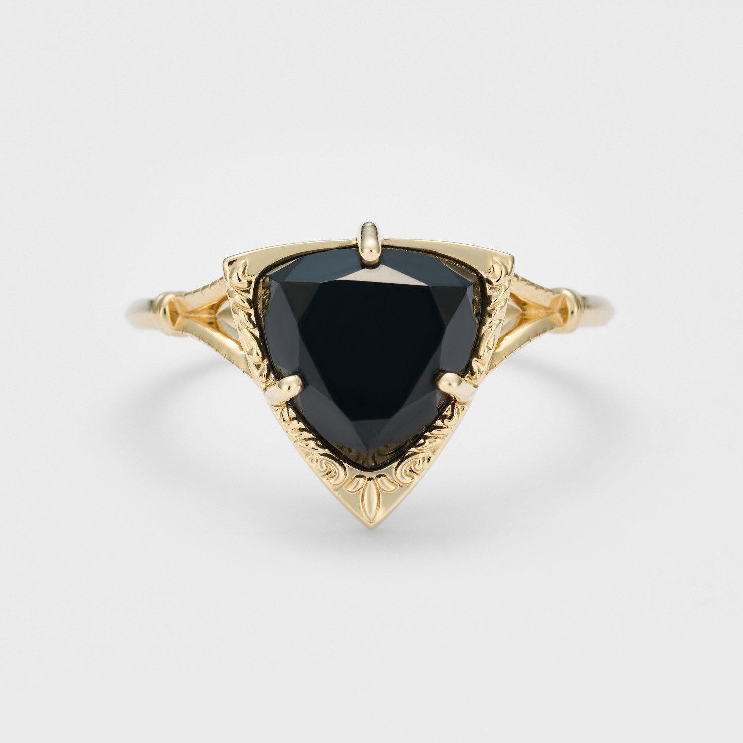 深邃黑色尖晶石帶來沈穩氛圍,搭配植物雕刻圖紋與背面鏤空植物花紋設計,結合古典氣息與現代感,展現內斂魅力。