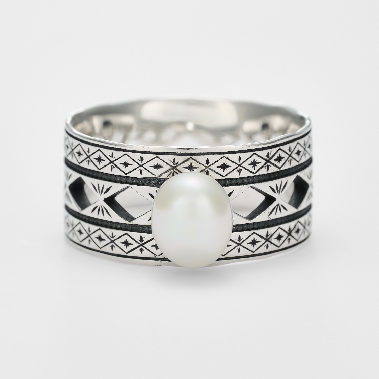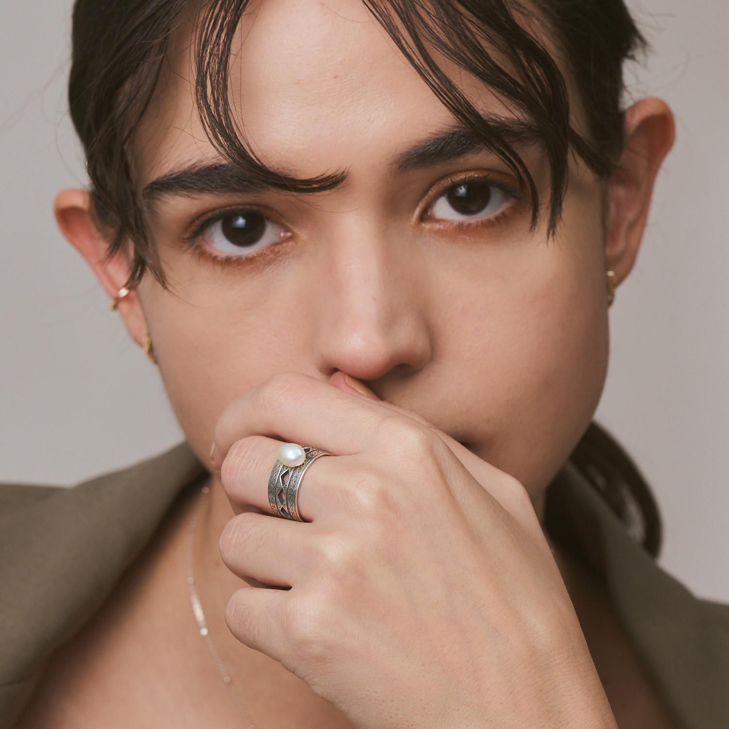 鏤空與幾何雕刻勾勒民俗風格,巧妙地嵌入柔和形狀的珍珠,結合古美加工與金屬和珍珠的對比,營造溫柔且富有層次的復古氣息。