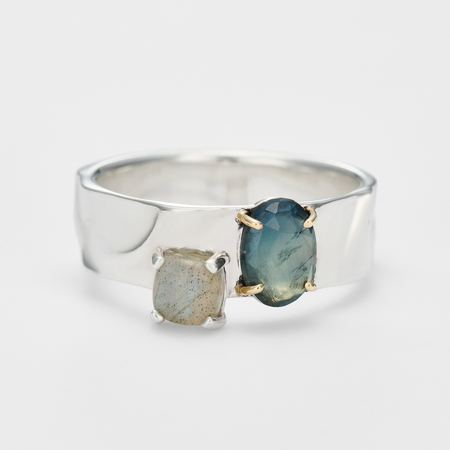由兩顆稍微不對稱的寶石排列,青綠色藍寶石與灰色拉長石的對比,展現獨特個性。10K的鑲爪與金銀色對比,設計現代且典雅。戒圈的紋理靈感來自平靜海面上的水波,細膩中蘊含動感。