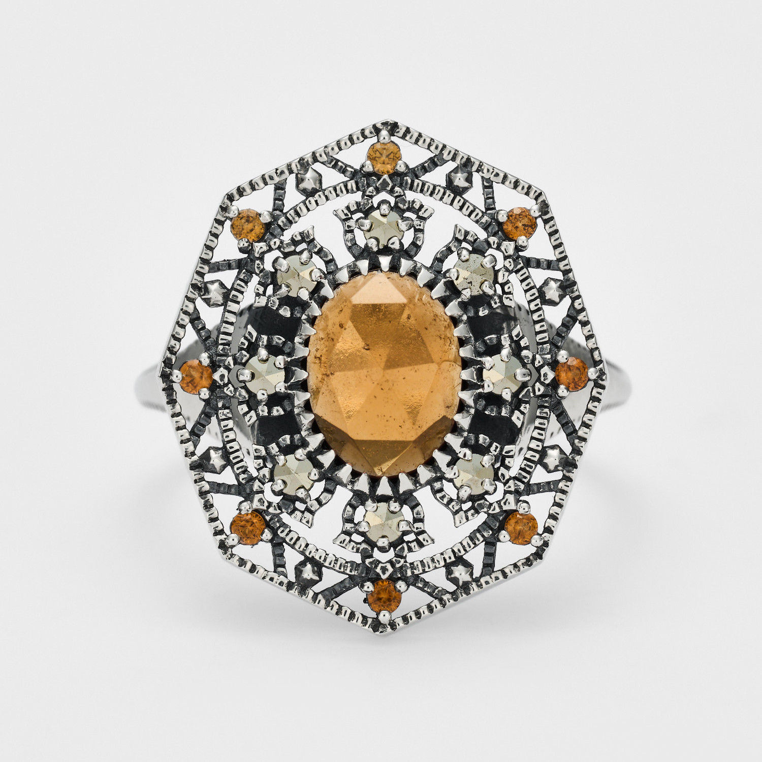 橘色石榴石如夕陽般溫暖迷人,搭配白鐵礦與細緻鏤空設計,營造古董珠寶般的深邃質感,象徵情感與能量。
