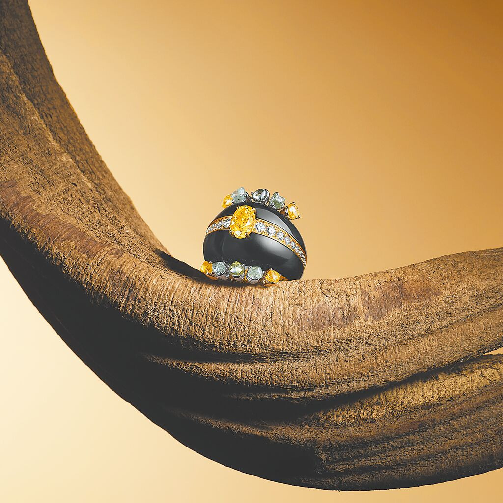 猴麵包樹是波札那的古老樹種,挺拔參天的巨樹傲然支撐起整個生態系統,孕育無數生命,因此在當地有著「生命之樹」的美譽,De Beers以大膽飽滿的黑玉、白鑽和彩鑽演繹Baobab Magnitude珠寶的非凡氣勢,並融入可拆解轉換珠寶的設計巧思,致敬大自然孕育生命的神奇之美。