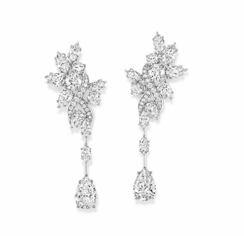 海瑞溫斯頓綺隱Secret Cluster系列珠寶立體雕塑設計美感別具一格,鑽石耳環,鑲嵌總重約1.52克拉的鑽石,垂吊水滴型切工鑽石為可拆卸式,重現海瑞溫斯頓代表性的Cluster錦簇鑲嵌設計。