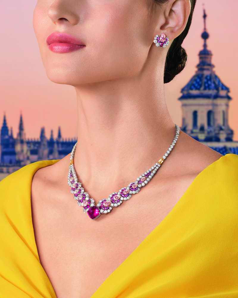 海瑞溫斯頓Seville項鍊中央鑲嵌一顆約 9.53 克拉的紅寶石,周圍以 64 顆水滴型切工與圓形紅寶石交錯環繞,層層疊映出塞維亞夕陽餘暉的暖紅光彩;摩根石、托帕石與鑽石則鑲嵌於 18K 玫瑰金與鉑金之上,宛若城市光影交錯的金色脈動,為整件作品增添迷人層次感與輕盈律動。Seville耳環則延續相同的色彩語彙,以水滴型切工摩根石為主石,點綴紅寶石與鑽石的半環設計,演繹鬱金香花型設計。這件彩寶作品不僅展現海瑞溫斯頓對珍稀寶石的卓越鑑賞力,更體現品牌在頂級珠寶創作中對自然景緻與文化意象的細膩詮釋。