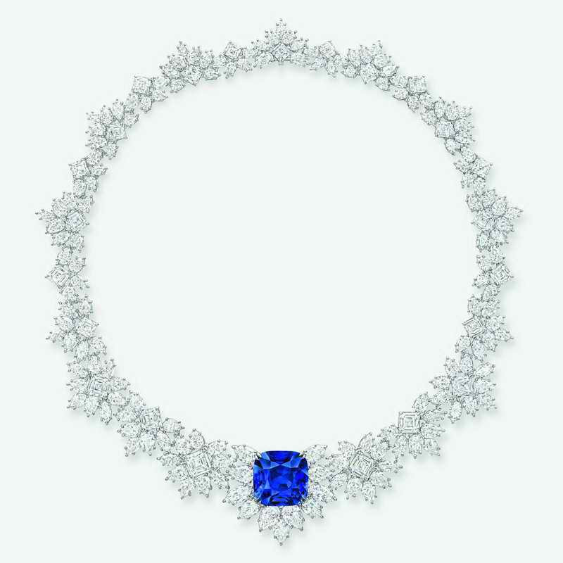 海瑞溫斯頓The Incredibles 頂級珠寶系列藍寶石與鑽石項鍊及耳環精選自斯里蘭卡、擁有絲絨般光澤的珍稀藍寶石悉心鑲嵌而成,項鍊克拉數高達約 38.88 克拉,為本次展出頂級珠寶作品中克拉數最高的焦點之作。