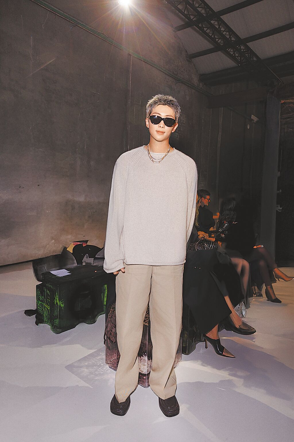 RM相較於上次看秀的緊張模樣,這次現身明顯放鬆很多。(Bottega Veneta提供)