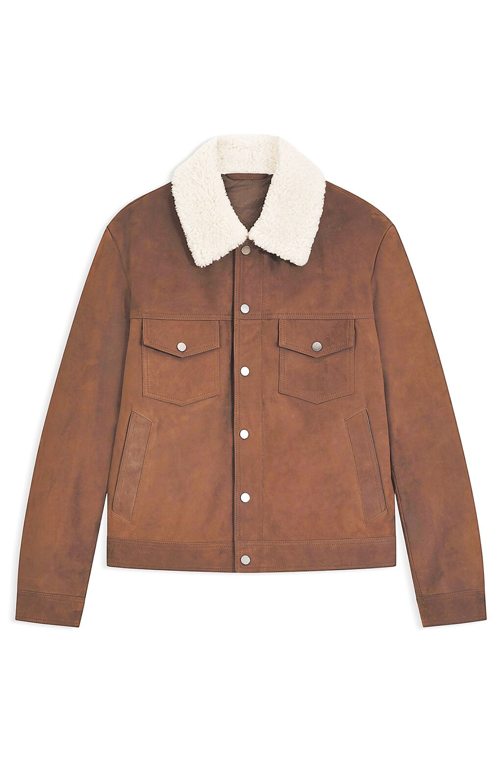 BECKHAM×BOSS系列絨毛翻領裝飾紅褐色小牛皮夾克,5萬2900元。(BOSS提供)
