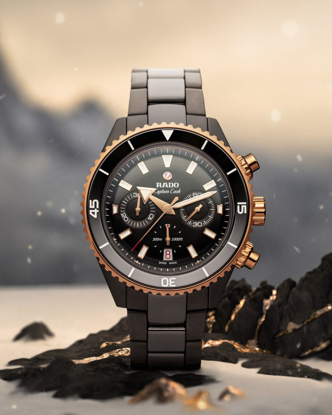 在阿爾卑斯山脈的心臟地帶,Captain Cook 庫克船長高科技陶瓷計時碼錶宛如金色洞窟中的寶藏靜靜棲息。這片猶如星辰鍛爐般的原始空間,映襯出時計現代而大膽的風格。黑色高科技陶瓷錶殼以霧面與拋光交織出層次感,細緻的玫瑰金色點綴如同夜空中閃爍的星光,腕錶內藏由Rado 瑞士雷達表 R801 自動機芯驅動的計時功能,擁有長達59小時的動力儲存,猶如在高山探險時刻守護著時間的準確。這款腕錶不僅展現風格,更在功能與美學間完美融合,猶如晴朗夜空中灑落的金色星河,為每個珍貴的節慶時刻增添璀璨光芒。