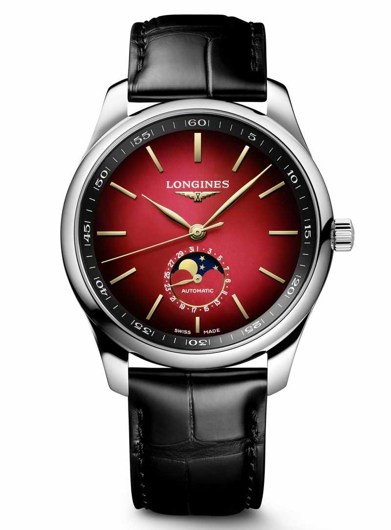 此錶採用42毫米不鏽鋼錶殼,並搭載紅色太陽放射飾紋磨砂錶盤。錶盤巧妙的漸變色澤令人聯想到充滿詩意的日出景象—吉祥地象徵著全新開始。優雅的造型鍍金指針與鑲貼時標讓外觀更顯精緻,日期指示則圍繞著6點鐘月相顯示。藉由透明底蓋設計,可一覽鍍金自動盤上的鐫刻奔馬圖案和徐悲鴻的個人落款。這款特製的自動盤利用手腕動作讓該藝術作品栩栩如生,並結合機械精準性與雋永優雅風韻。