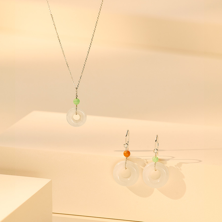 【小團圓】系列涵蓋墜飾與耳環等款式。JADEGIA玉世家設計團隊以經典圓環造型為靈感核心,選用白翡主石,並點綴綠翠或紅翡小圓珠,透過精緻比例與配色,形成柔和而富有層次的視覺對比。