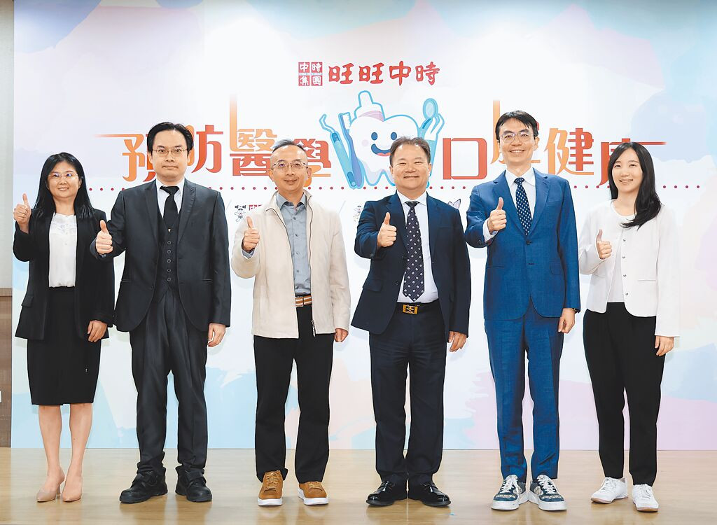 旺旺中時媒體集團26日在台大醫院國際會議中心舉辦「預防醫學口腔健康」講座,中國時報副社長王儒哲(右三)邀請世樺牙醫診所醫師張天欣(右起)、新北市牙醫師公會理事長温世政、三重宏仁醫院營養師李雅慧(左起)、德華牙醫診所院長蔡孝誠、蝴蝶式牙周棒發明家許書欽,向民眾宣導口腔健康的重要性。(黃世麒攝)