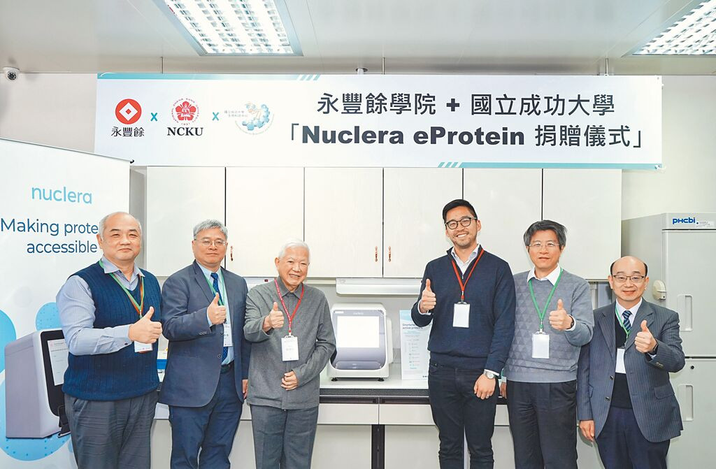 永豐餘學院院長何壽川(左三)捐贈高通量蛋白篩選系統予成功大學,厚植新藥研發實力。左起依序為成大生科院院長王育民、成大副校長李永春、永豐餘學院院長何壽川、Nuclera執行長Michael Chen、成大醫學院院長鄭修琦、成大臨床醫學中心主任蘇文。(永豐餘學院提供)