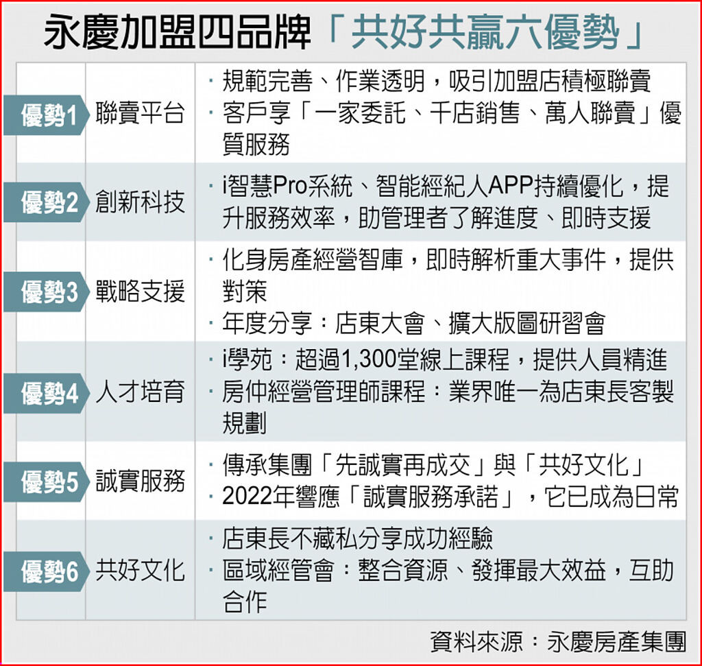 永慶房產集團加盟事業處總經理莊志成表示,「加盟總部要做店東的強力後盾,幫助加盟店賺錢!」這是董事長孫慶餘給永慶加盟總部的使命。我們也在孫董事長的指導下,發展出獨有的「共好共贏六優勢」:聯賣平台、創新科技、戰略支援、人才培育、誠實服務、共好文化。