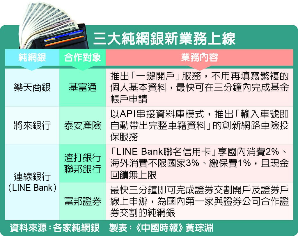 跟進國際趨勢,金管會開放三家純網銀,樂天銀行在2021年1月19日營業後,後續LINE Bank及將來銀行陸續開業,不過遇到疫情,拓展業務不易,迄今仍無法獲利,不過隨著疫情趨緩,百工百業恢復正常,三家純網銀不約而同在今年擴大布局,新業務相繼到位。
