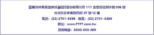 【富蘭克林華美投信獨立經營管理】本文提及之有價證券僅為舉例用,非為有價證券之推介。本文提及之經濟走勢預測不必然代表本基金之績效。以上指數試算結果並非代表特定基金之投資成果,亦不代表對特定基金之買賣建議,基金不同於指數,基金可能會有中途清算或合併等情形,投資人無法直接投資指數。經金融監督管理委員會申報生效之基金,不表示絕無風險。基金經理公司以往之經理績效不保證本基金之最低投資收益;基金經理公司除盡善良管理人之注意義務外,不負責本基金之盈虧,亦不保證最低之收益,投資人申購前應詳閱基金公開說明書。本基金自上櫃日起以追蹤標的指數之績效表現為投資目標,基金之投資績效將視其追蹤之標的指數之走勢而定,當標的指數波動劇烈時,基金之淨資產價值將有較大的波動風險。本基金雖以追蹤標的指數為操作目標,然下列因素仍可能使本基金報酬偏離標的指數報酬,且偏離方向無法預估:本基金可能因應申贖或維持所需曝險比例等因素,需每日進行基金曝險調整,故基金淨值將受到每日交易之有價證券或期貨成交價格、交易費用、基金其他必要之費用(如:經理費、保管費、上櫃費等)、投資組合成分價格波動或基金整體曝險比例等因素之影響,而使基金報酬與投資目標產生偏離。本基金投資組合與標的指數相關性,將受到基金持有之有價證券或期貨與標的指數之相關性等因素影響。此外,基金投資組合中持有的期貨部位,因期貨的「價格發現」功能使其對市場信息、多空走勢之價格反應可能不同於債券,因此當市場出現特定信息時,基金淨值將同時承受期貨及債券對市場信息反應不一所產生的價格波動影響,可能使本基金報酬將與投資目標產生偏離。本基金以新臺幣計價,而本基金所投資的有價證券或期貨標的可能為新臺幣以外之計價貨幣,因此本基金承受相關匯率波動風險可能使本基金報酬與投資目標產生偏離。本基金自成立日起至上櫃日前(不含當日),經理公司不接受本基金受益權單位之申購及買回。「 ICE 20年期以上BBB級成熟市場美元公司債指數」係由ICE指數股份有限公司編製及計算;惟「富蘭克林華美20年期以上BBB投資級美元公司債ETF」並非由ICE指數股份有限公司贊助、認可、銷售或推廣,且ICE指數股份有限公司不就使用「 ICE 20年期以上BBB級成熟市場美元公司債指數」或該指數於任何特定日期、時間所代表數字之預期結果提供任何明示或默示之擔保或聲明。與指數值及其成分股清單有關之一切著作權均歸ICE指數股份有限公司所有。富蘭克林華美證券投資信託股份有限公司業已就使用該著作權發行「富蘭克林華美20年期以上BBB投資級美元公司債ETF」之行為,自ICE指數股份有限公司取得完整之使用授權。本基金不受存款保險、保險安定基金或其他相關保障機制之保障。故投資本基金可能發生部分或全部本金之損失,最大可能損失則為全部投資金額。金融消費爭議處理及申訴管道:就本公司所提供之金融商品或服務所生紛爭投資人應先向本公司提出申訴,若三十日內未獲回覆或投資人不滿意處理結果得於六十日內向「金融消費評議中心」申請評議。本基金得投資具總損失吸收能力債券(TLAC Bond),且投資於TLAC Bond上限為本基金淨資產價值百分之三十(30%),由於是類債券為新的運作機制,因此除了流動性風險及變現性風險外,還可能有金融領域集中度風險、本金減計風險、轉換風險及未知風險等相關風險。有關基金應負擔之費用已揭露於基金公開說明書或簡式公開說明書中,投資人可向經理公司及基金銷售機構索取,或至公開資訊觀測站及經理公司網站中查詢。本基金為投資於標的指數之成分證券或因應標的指數複製策略所需,得投資於符合美國Rule 144A規定之債券,該債券屬私募性質,較可能發生流動性不足,財務訊息揭露不完整或因價格不透明導致波動性較大之風險。基金配息不代表基金實際報酬,且過去配息不代表未來配息;基金淨值可能因市場因素而上下波動,於獲配息時須一併注意基金淨值之變動。本基金配息可能由基金的收益或收益平準金中支付。任何涉及由收益平準金支出的部份,可能導致原始投資金額減少。本基金淨值組成項目,可於經理公司網站查詢。本文提及之經濟走勢預測不必然代表基金之績效,基金投資風險請詳閱基金公開說明書。詳細指數編製規則,請參閱本基金公開說明書。投資人申購本基金係持有基金受益憑證,而非本文提及之投資資產或標的。以上僅為ETF追蹤指數績效或殖利率之表現,不代表本ETF基金之實際報酬率或配息率及未來績效保證,不同時間進場投資,其結果將可能不同,且並未考量交易成本。