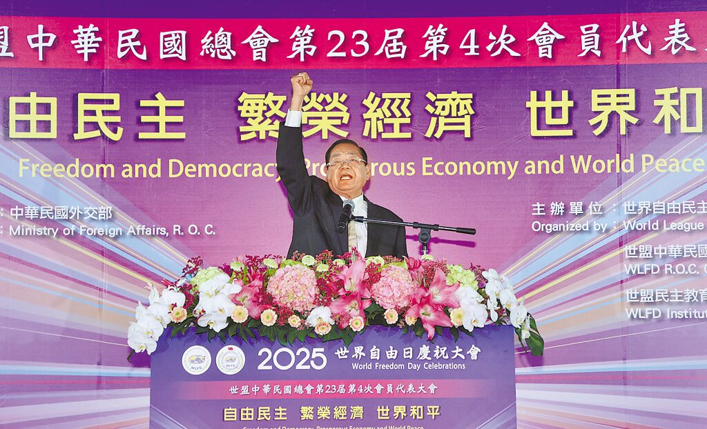 2025年世界自由日慶祝大會23日在台北市國軍英雄館舉行,世盟總會長饒穎奇與世盟中華民國總會理事長曾永權、外交部NGO國際事務會執行長陳剛毅、國民黨立委林德福等人共同主持啟動儀式、敲響自由鐘,藍委謝衣鳯也在大會發表演說。曾永權說,面對世局詭譎多變,多處戰事未歇的現在,期許世盟成為世界和平的催化劑。