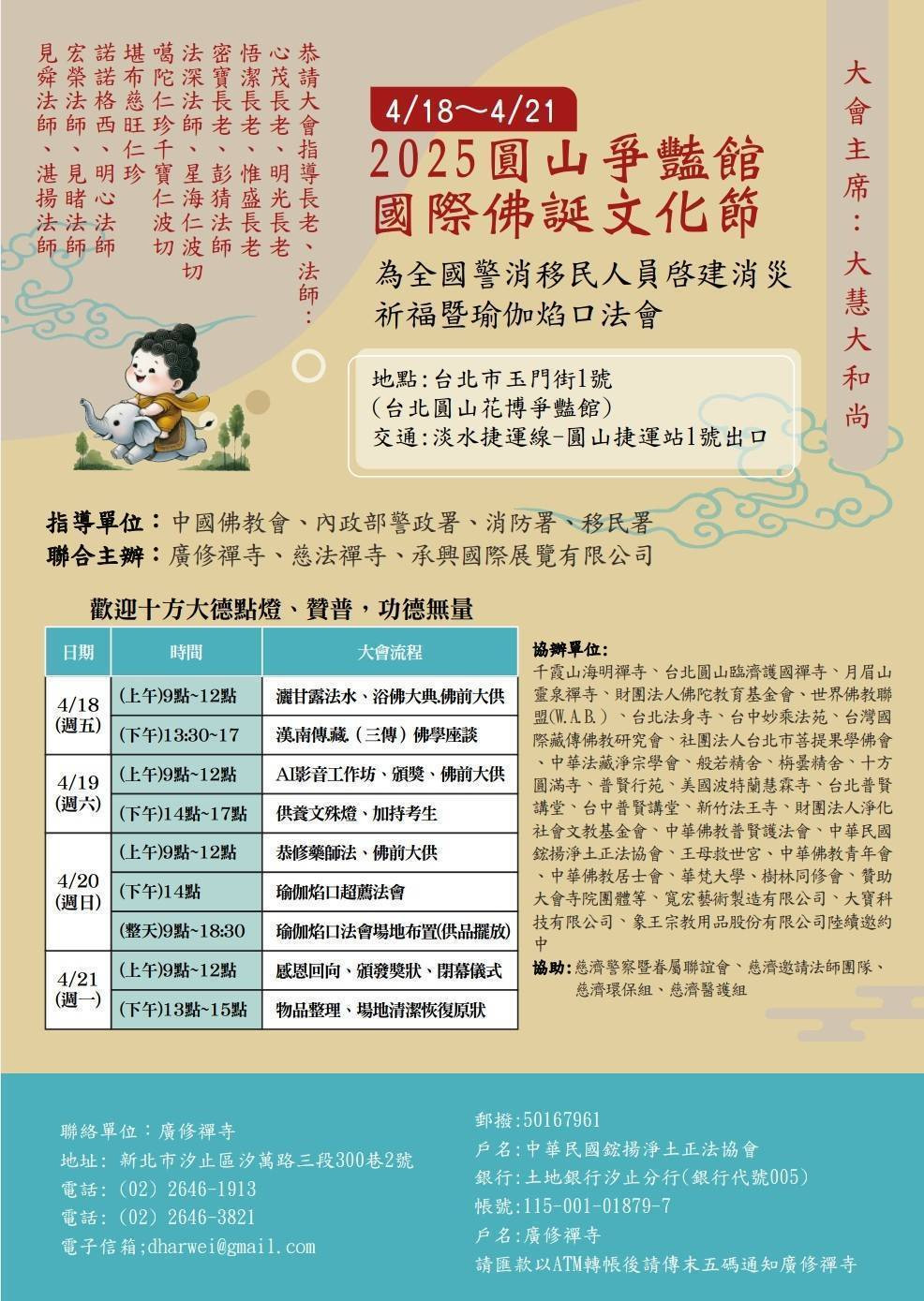 2025 國際佛誕節於4月18日至21日為期四天,在北市圓山爭艷館展開,結合蔬食博覽會,將有百家共襄盛舉,此次佛誕節並為全國警消及移民人員啓建消災祈福暨瑜伽焰口法會。