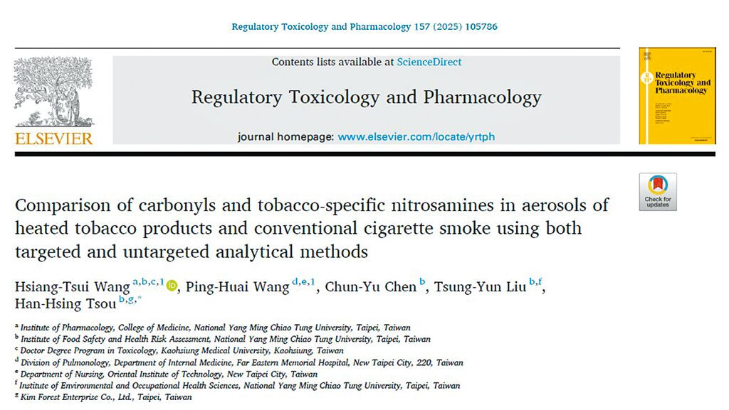 陽明交通大學研究團隊發表台灣首篇,針對加熱菸氣霧化學成分的研究,發表於知名的國際科學期刊《Regulatory Toxicology and Pharmacology》,研究結果顯示透過「加熱」而非「燃燒」方式釋放尼古丁與氣霧,有效減少高溫裂解所產生的毒性化學物質。(畫面來源:國際科學期刊《Regulatory Toxicology and Pharmacology)