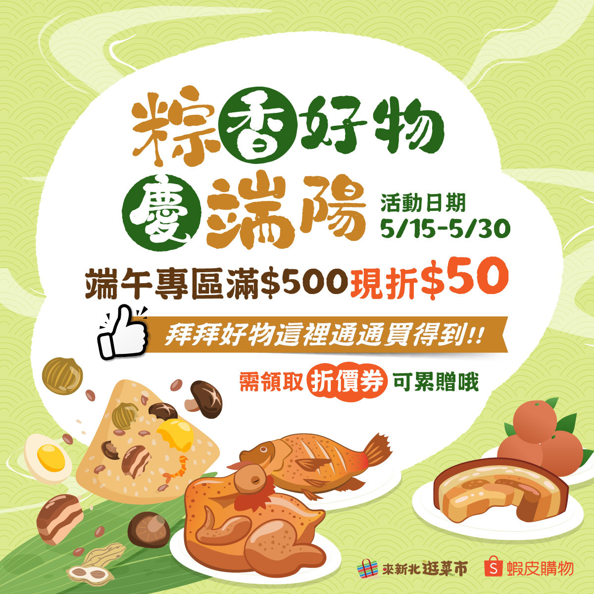 今年的端午優惠活動來囉!新北市政府市場處於114年5月15日至5月30日期間,在線上平臺「來新北逛菜市」舉辦「粽香好物慶端陽」限時優惠促銷活動,包括粽子、三牲組合及金紙用品等端午必備用品,只要單筆消費滿500元即可享有現折50元優惠,讓市民輕鬆備齊端午節慶所需,在家也能感受濃厚端午氣氛!