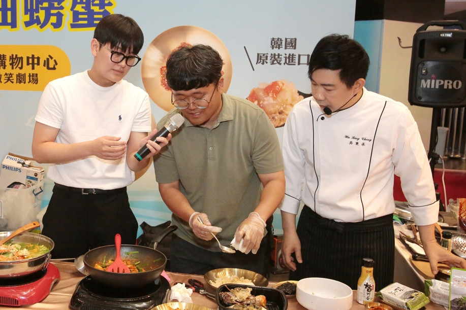 奉船長李奉國代表(中)親臨現場及型男主廚-吳秉承(右)與民眾示範韓國道地醬蟹吃法(圖/韓華國際提供)