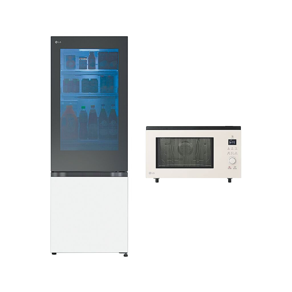 新光三越集雅社LG敲敲門變頻雙門冰箱332L Insta View+39L蒸烘烤微波爐,特價5萬4800元,原價5萬9800元(92折)。(新光三越提供)