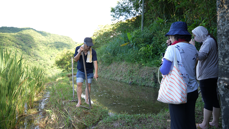 午後的陽光灑下,梯田閃閃發亮。旅人脫鞋走入田間,泥土包裹腳底,微涼中有生命的脈動。導覽員說,這裡的田是活的。水中有青蛙、草間有花、天空倒映在田裡,每一格田都像畫布。