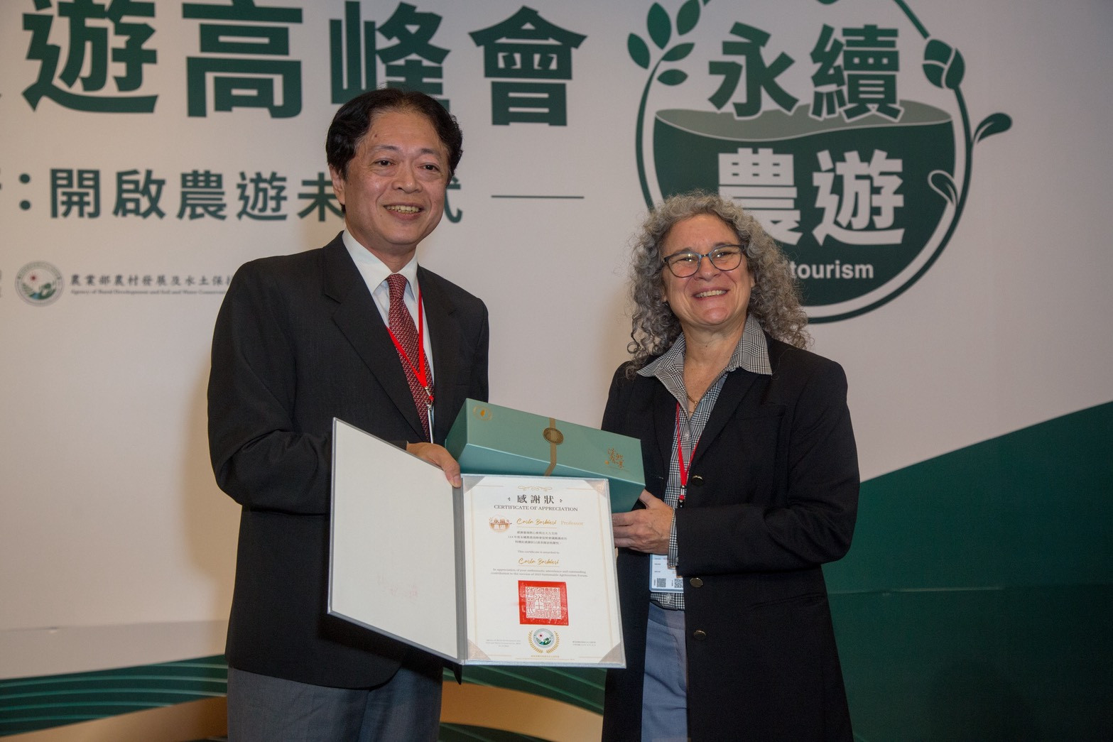 農業部林家榮主任秘書致贈感謝狀與臺灣特色紀念品予全球農業旅遊聯盟Carla Barbieri主席