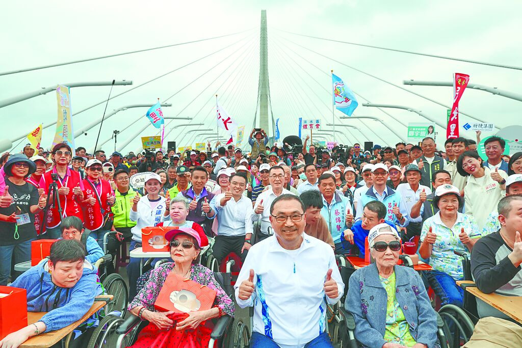 淡江大橋17日下午舉辦通車前首場暖身活動「淡水八里.橋見未來」,新北市長侯友宜與在地百歲人瑞及長者們一同合影。(鄧博仁攝)