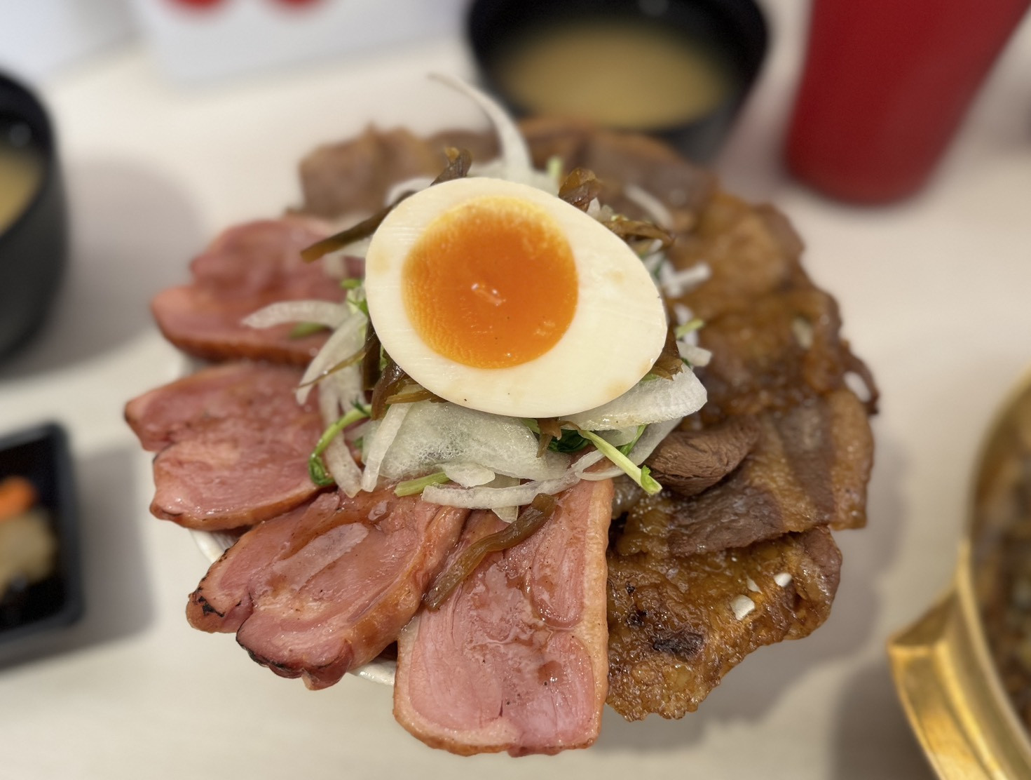 在餐點設計上,定食8以「龍魂精神」與「強棒出擊」為概念,推出三款聯名主打定食。首先登場的《遍地開花牛鴨雙拼》,以燻烤櫻桃鴨腿搭配日式醬燒牛胸腹,透過桃木燻香與燒肉油脂交織,呈現層次分明的風味組合;《開蕊熔岩玉子豬排》則選用厚切豬五花,搭配章魚花枝排與起司醬,主打濃郁口感與視覺效果;海鮮愛好者則可選擇《龍光乍現蟹醬銷魂麵》,以蟹黃、蟹膏炒製基底,搭配鱈蟹肉與餃類配料,強調海味濃縮的特色。
