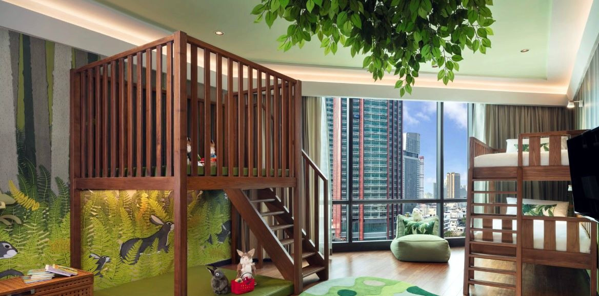 曼谷暹羅凱賓斯基的單臥室動物主題套房,最近迎來了重量級新成員——大象主題套房。由才華洋溢的泰國藝術家親自操刀,透過細膩的牆面手繪與創意技巧,將森林生態栩栩如生地展現在孩子眼前。