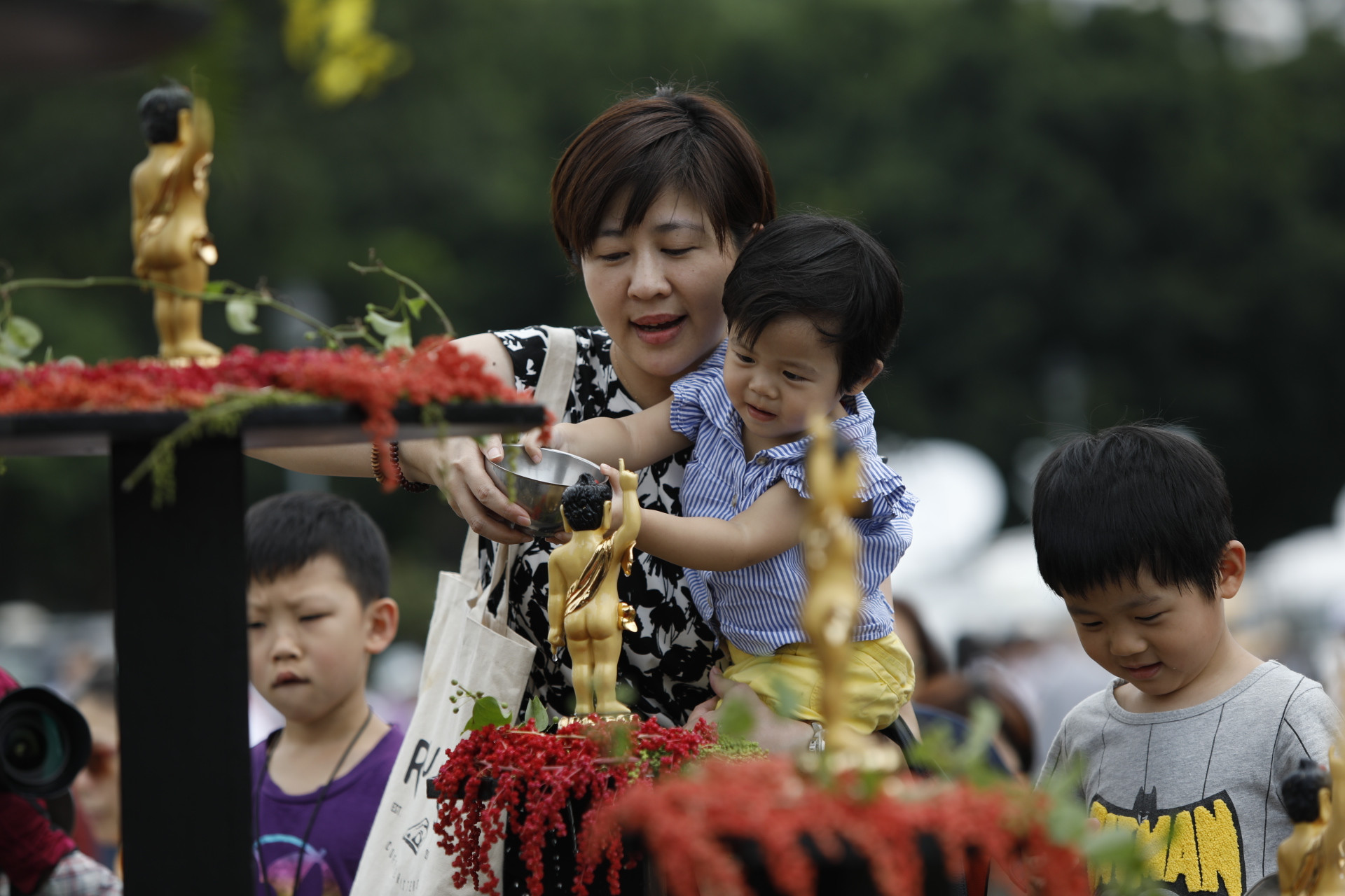 迎接佛誕日與母親節,感念佛陀和親人的恩澤,來到法鼓山「心靈環保日」可以參加多項適合家庭、親子共同體驗的項目,包括浴佛、鈔經祝福、撞鐘祈福、心光AI、關懷你我他、心六倫超人等「感恩心旅」;參與浴佛的民眾,可掬一勺香湯為悉達多太子像沐浴,現場還能領取法師親贈的壽桃,感受僧團溫暖祝福。