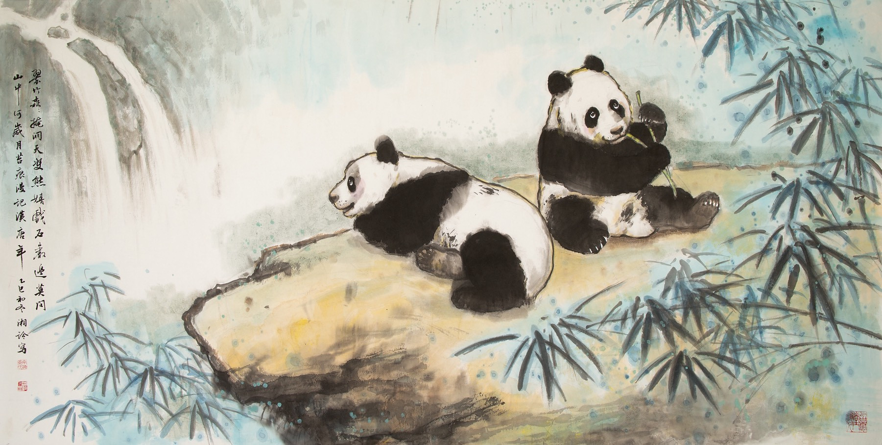 黃湘詅|《泉邊雙寶嬉戲圖》 雙熊貓於泉畔嬉戲,筆墨溫潤生動,流露自然童趣與東方生活美學。(圖片提供/白雲堂藝術研究會)