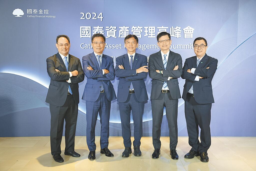 國泰金控在銀行、保險穩健發展下,完備資產管理事業為第三獲利引擎,並集結其他子公司通路、商品開發能力,共同推動台灣資產管理國際化;由左至右為國泰金控資深副總經理孫至德、國泰人壽總經理劉上旗、國泰投信董事長張錫、國泰世華銀行總經理李偉正及國泰投信總經理張雍川。(國泰金控提供)