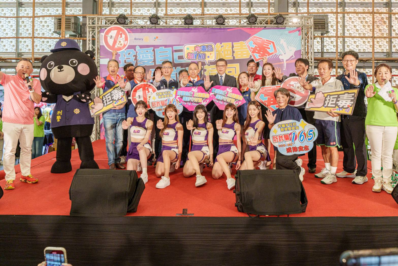 國際扶輪3522地區總監侯玳梁、刑事局副局長黃壬聰、臺北市副市長張溫德、各扶輪社長及雲豹啦啦隊宣誓反毒決心