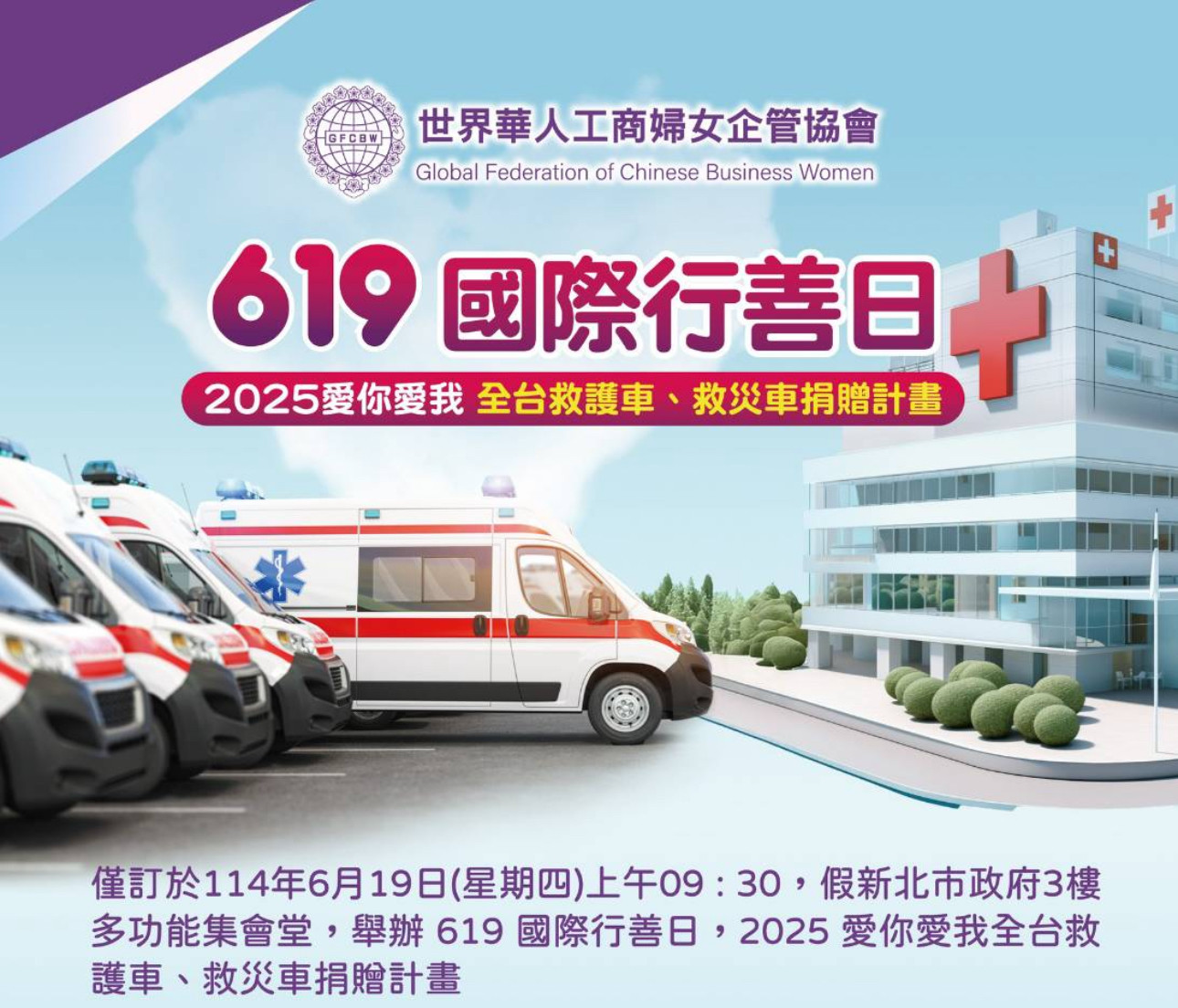 世界華人工商婦女企管協會(簡稱世華)將於2025年6月19日假新北市政府大樓3樓多功能集會堂舉行「2025愛你愛我—救護車、救災車捐贈計畫」捐贈儀式,屆時,新北市政府、花蓮縣政府、宜蘭縣政府、金門縣政府、高雄市政府及消防局將派員出席,世華全球各分會代表也一同見證這場充滿愛與關懷的公益盛事。