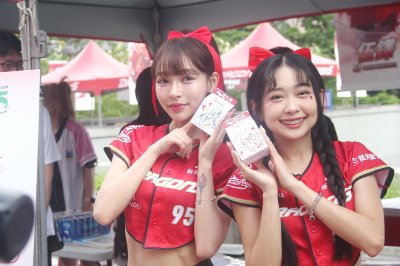 味全龍啦啦隊「小龍女」林襄及小蛙出席義賣活動,吸引大批球迷駐足。
