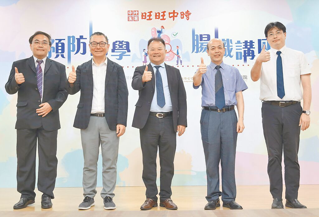 第三屆「預防醫學 腸識講座」1日登場,新光醫院一般外科主治醫師方躍霖(左起)、昕新智慧診所院長朱光恩、中國時報副社長暨總經理王儒哲、北投健康管理醫院肝膽腸胃科羅鴻源院長及林口長庚醫院胃腸肝膽科主治醫師陳俊瑋合影留念。(范揚光攝)