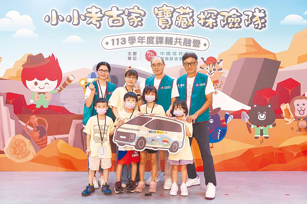 中信慈善基金會12日舉辦「113學年度課輔共融營」,由副董事長陳國世(後排右二)、執行長高人傑(後排右一)代表捐贈北區兒童之家全新交通車。(中信慈善基金會提供/黃琮淵台北傳真)